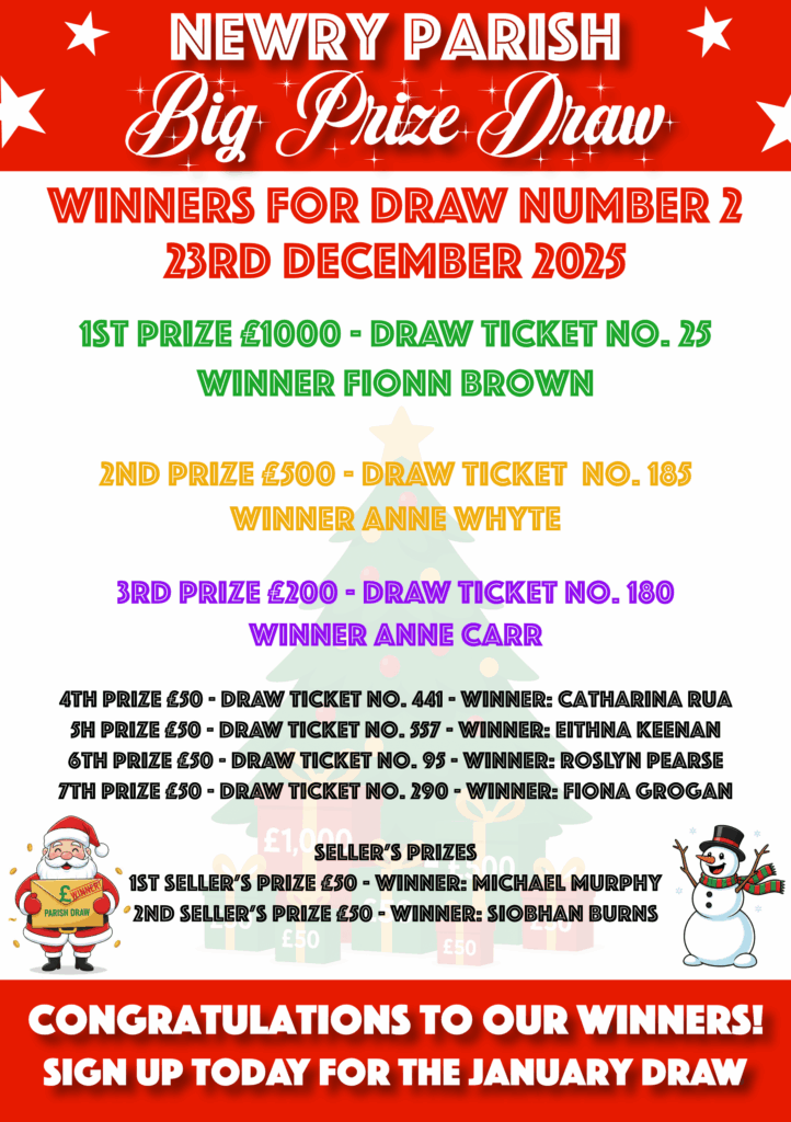 Is it your lucky day? We are delighted to announce the winners of £2000 in cash prizes for our December 2025 Draw! Congratulations to our winners! Sincere thanks to the Parish Draw Office Team, Ticket Sellers and everyone else who helped make our draw a big success. Sign up today to be in with a chance of winning big in our January draw.